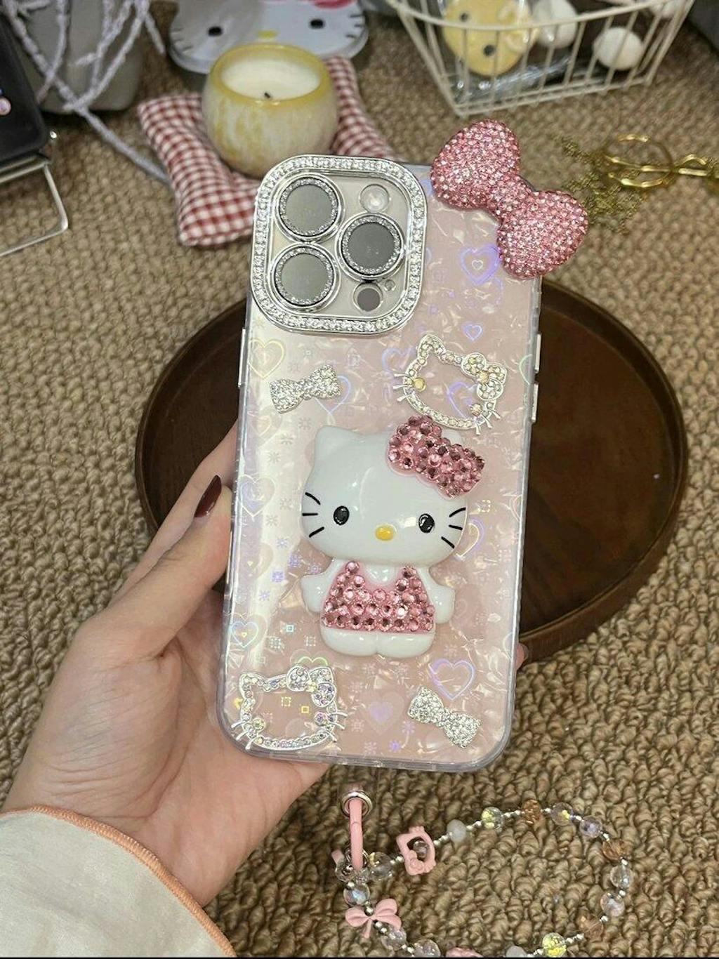 Cartoon Diamonds Pink 3D Kitty Phone Case For iPhone 17 16 15 14 13 12 11 Pro Max Bling Glitter TPU Clear Back Cover with Charm