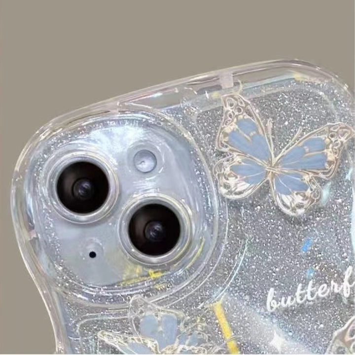 Butterfly Wavy Edge Shiny Clear Lanyard Phone Case For All iPhone 17 Air Pro Max 16 15 14 13 12 11 Pro Plus