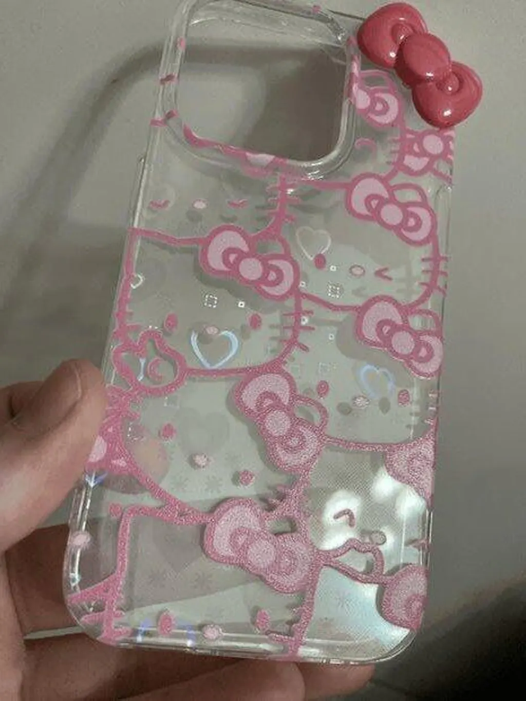 Kitty Pink 3D Bow Clear Holographic Subtle Heart Cute Kawaii Phone Case For iPhone 15 Pro Max 14 13 12 Pro