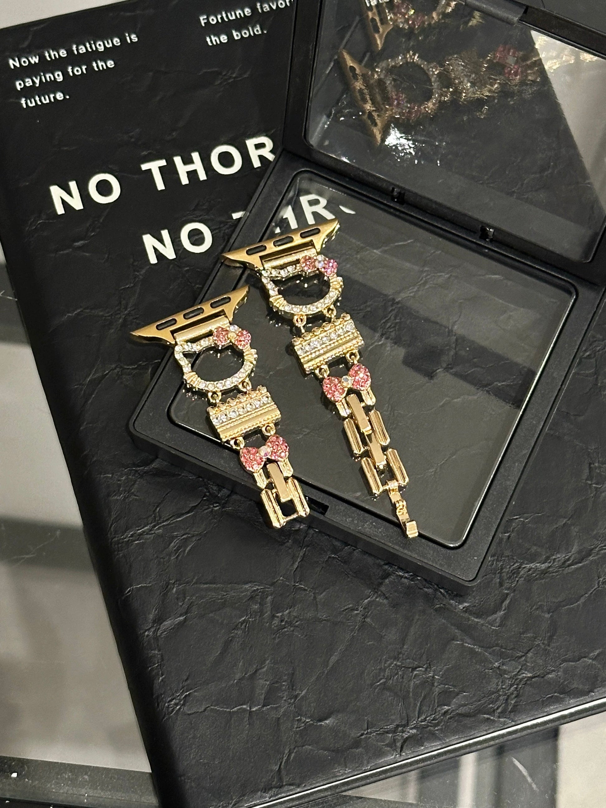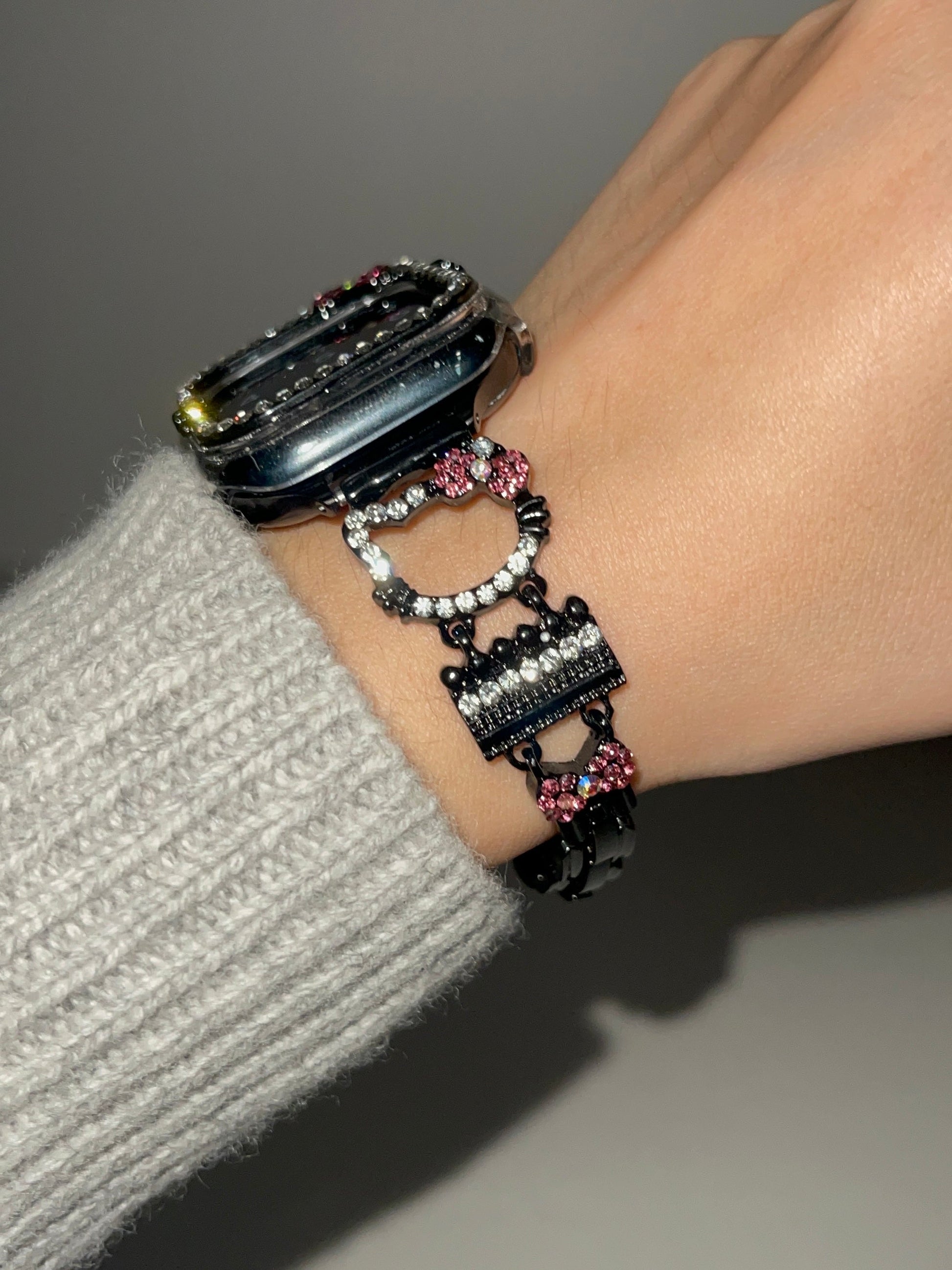 Bling Diamond Jewelry Metal Watch Strap Kitty Shape Bands with Crystal Tempered Glass Screen Protector Case for Apple Watches
