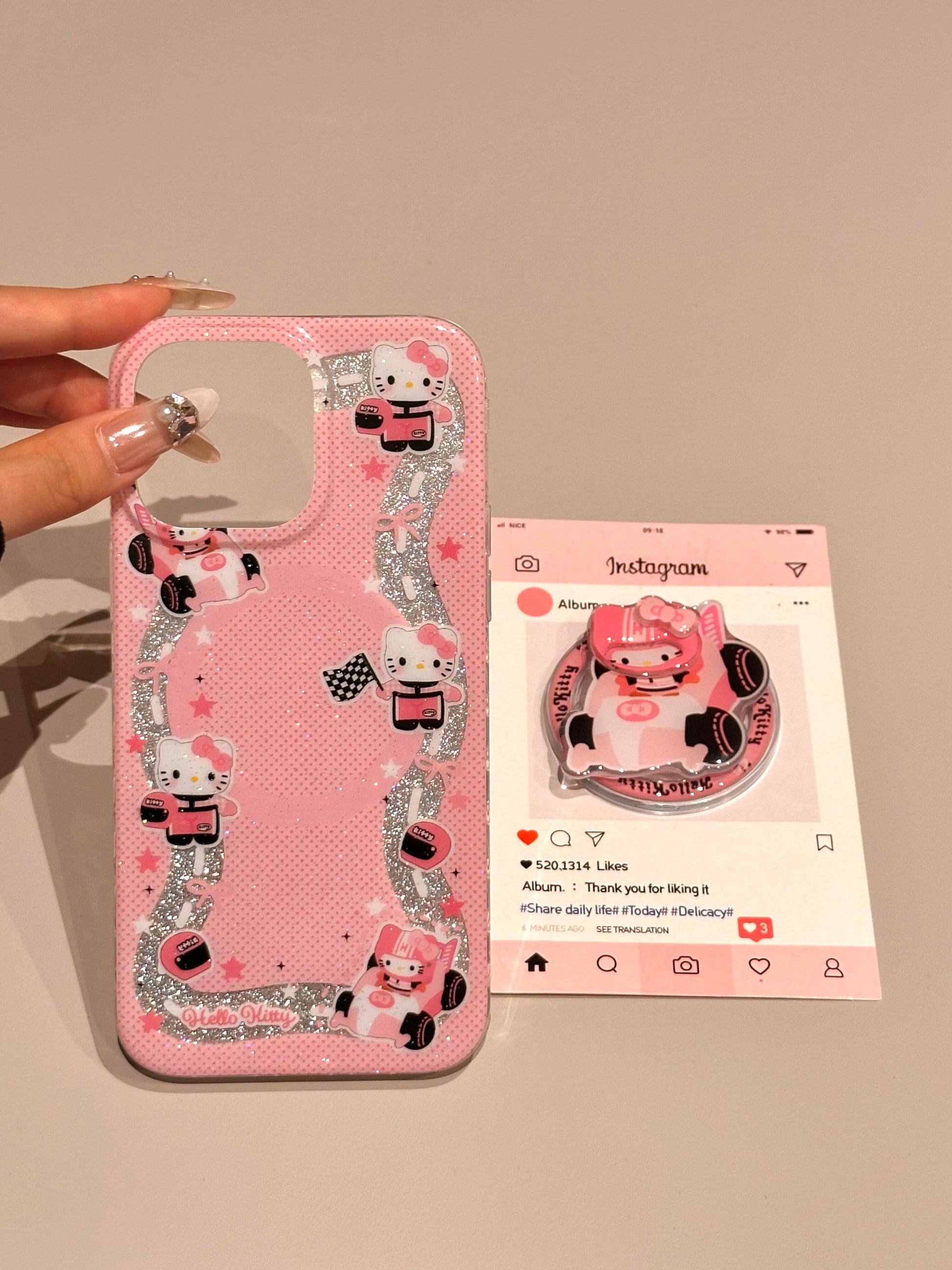 Kitty Pink Racing Glitter Cute Kawaii MagSafe Case + MagSafe Stand Holder / Phone Grip